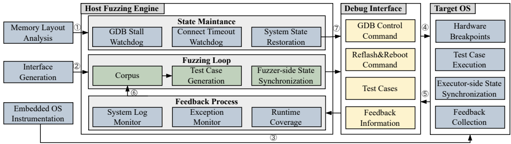 嵌入式操作系统(Embedded OS)是各类终端与设备的基础运行环境,环境异构且资源受限,其潜在缺陷将影响设备安全与业务连续性。模糊测试是发现此类缺陷的有效技术。然而,现有嵌入式操作系统模糊测试多依赖内核插桩/日志或应用层入口,难以在缺少交互与系统底层库支持的的真实硬件上适配。