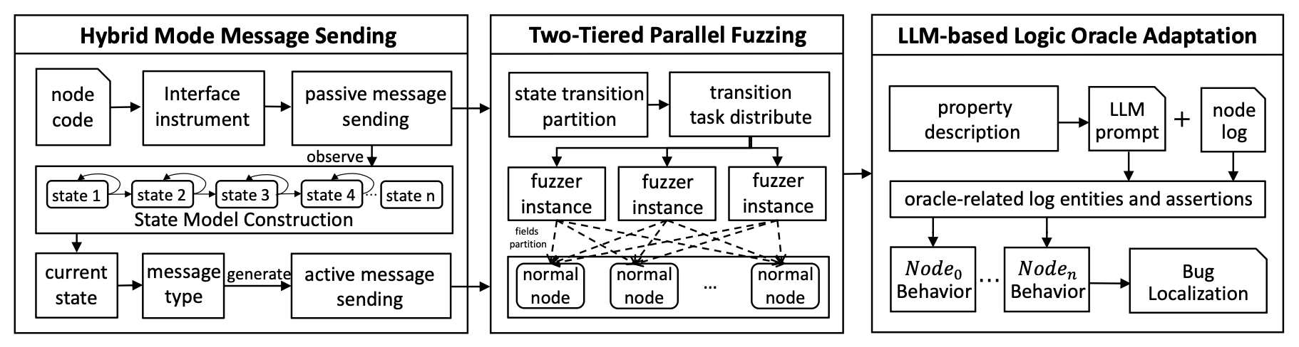 - 逻辑测试预言机适配困境:不同区块链系统日志格式差异巨大,人工构造逻辑漏洞检测器成本极高。Thor引入大语言模型(LLM)辅助的自动预言机生成技术,利用LLM从高层属性描述和系统日志中自动提取关键信息,合成用于检测共识漏洞、安全性违规等逻辑错误的断言脚本。