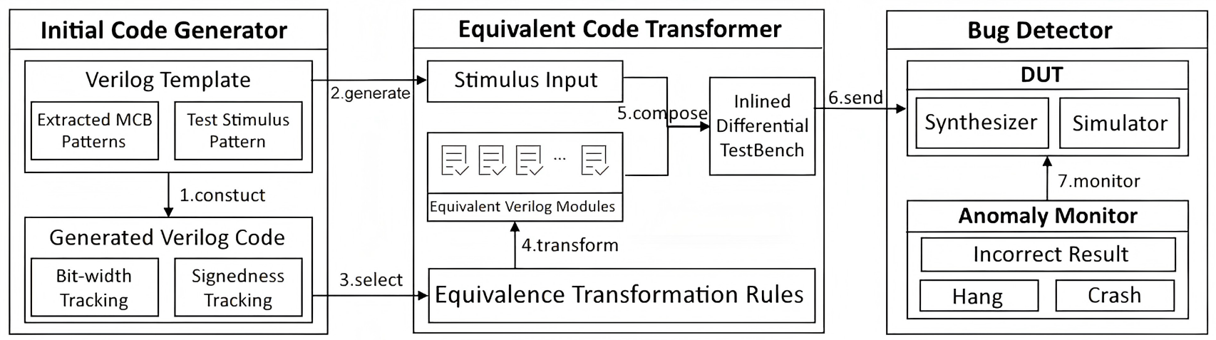 VeriEQ 的主要流程如下,包含三个重要组件:Initial Code Generator、Equivalent Code Transformer 以及 Bug Detector。