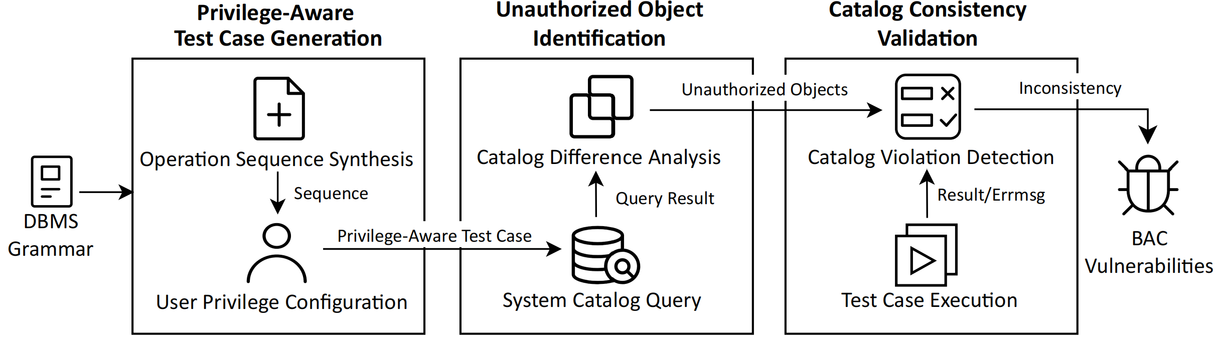 Beacon 的主要流程如下,包含三个重要组件:Privilege-Aware Test Case Generation、Unauthorized Object Identification 以及 Catalog Consistency Validation。