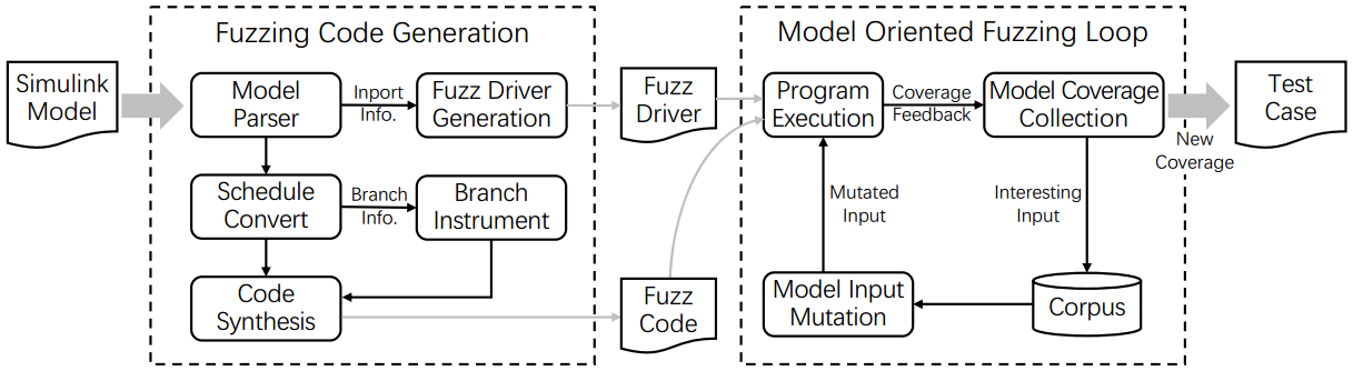 第五项研究成果是:CFTCG: Test Case Generation for Simulink Model through Code Based Fuzzing。该论文提出了CFTCG,一种基于代码模糊测试的Simulink模型测试用例生成方法。首先,CFTCG为模型生成模糊测试代码,其中包括关联模型输入信息的模糊测试驱动程序和带有模型级分支插桩的模型逻辑代码。然后将这些代码编译在一起来执行面向模型的模糊测试循环。在循环过程中,我们利用模型输入端口的字段信息和迭代执行之间的覆盖差异,实现更有针对性的输入数据变异。实验结果表明,与Simulink设计验证器和前沿的学术工作SimCoTest相比,CFTCG在决策覆盖率方面分别平均提高了47%和100%,在条件覆盖率方面分别提高了38%和44%,在MCDC方面分别提高了144%和232%。该工作由博士后苏卓和硕士生喻泽弘等共同参与完成。